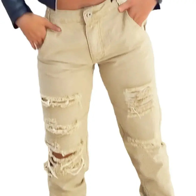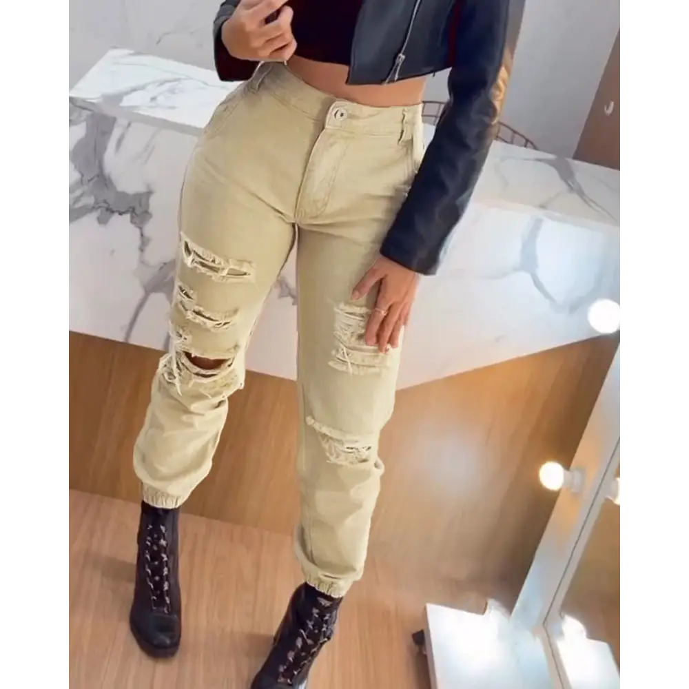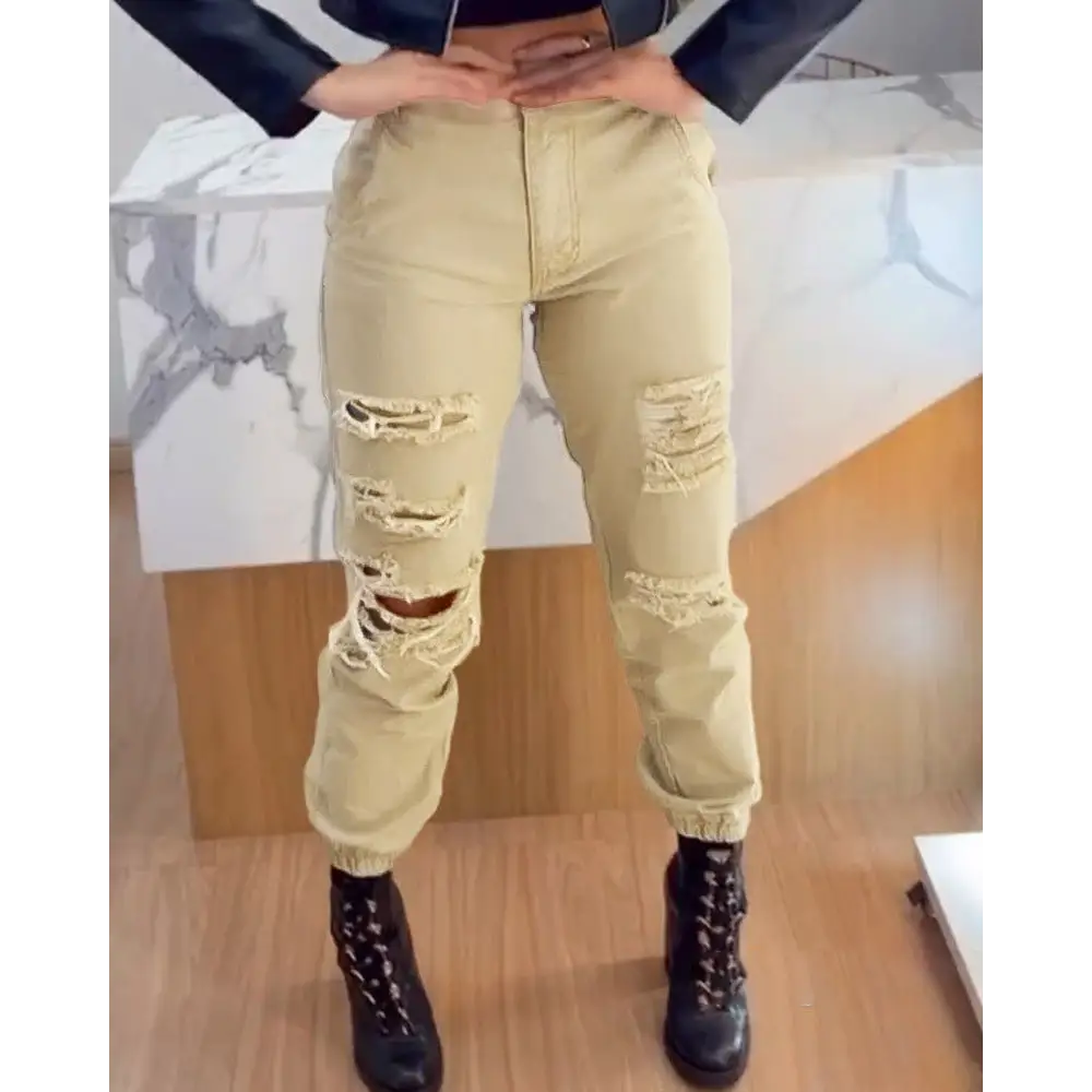 Elevate your casual wardrobe with the ChillTied High-Waist Ripped Ankle Pants. Crafted for both style and comfort, these pants feature a trendy high-waist design that flatters every silhouette. The edgy ripped details add a touch of attitude, making them perfect for any modern fashionista. Designed with a tapered ankle, they offer a sleek fit that pairs seamlessly with any top or footwear. Whether you're dressing up for a night out or keeping it casual during the day, these versatile pants are your go-to choice. Embrace effortless chic with the ChillTied High-Waist Ripped Ankle Pants today!