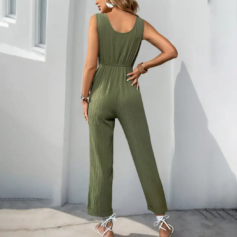 Step into summer with style and comfort in our V-neck Sleeveless Jumpsuit. This chic piece is a must-have for any beach outing or casual occasion. Designed with a flattering V-neckline and a detachable belt, it accentuates your figure effortlessly. The sleeveless design ensures you stay cool, while the spacious pockets add functionality. Made from lightweight, breathable fabric, this jumpsuit combines fashion with practicality seamlessly. Whether you're strolling by the shore or enjoying an evening out, this versatile jumpsuit is your go-to choice for effortless elegance in women's clothing.