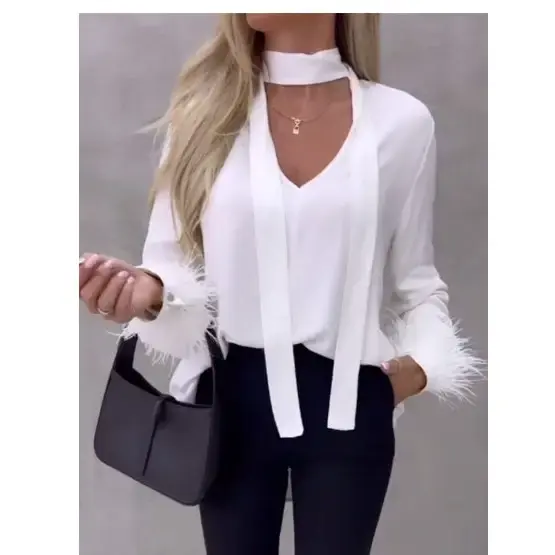 • ColorFlow V-Neck Streamer Tee with Feather Cuffs - LauBelle Brand