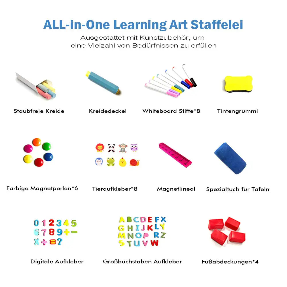 The multifunctional easel includes storage cups, trays, and plenty of accessories like chalk, whiteboard markers, number and letter stickers, animal magnets, and magnetic strips—perfect for fun learning, writing, math, and creative play.