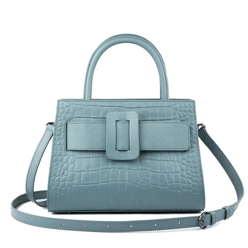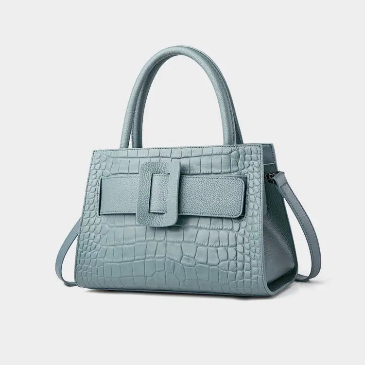 Elevate your style with the Cloud Blue Leather Double Strap Bag. Made from high-quality leather, this bag features a stunning cloud blue color that will surely turn heads. The double strap design not only adds a touch of sophistication but also provides superior comfort when carrying the bag. The spacious interior has enough room to store all your essentials while the zippered pocket ensures your valuable items are safe and secure. Whether you're heading to work or out for a day of shopping, this bag is the perfect companion. Upgrade your handbag collection with the Cloud Blue Leather Double Strap Bag.