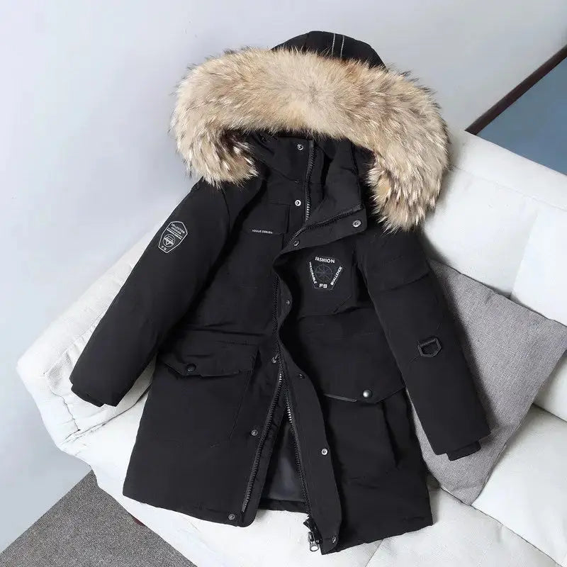 Experience ultimate warmth and style with the CozyBoys FurTrim Mid-Length Down Jacket. This elegantly designed jacket features luxurious fur trim along the hood, providing both a fashion-forward look and added comfort during chilly days. Its mid-length design ensures extra coverage, while the premium down filling guarantees unmatched insulation. Perfect for urban adventures or casual outings, this jacket blends functionality with sophistication. Its durable water-repellent exterior ensures that you stay dry in light rain or snow. Choose the CozyBoys FurTrim Jacket for a combination of timeless style and modern practicality.