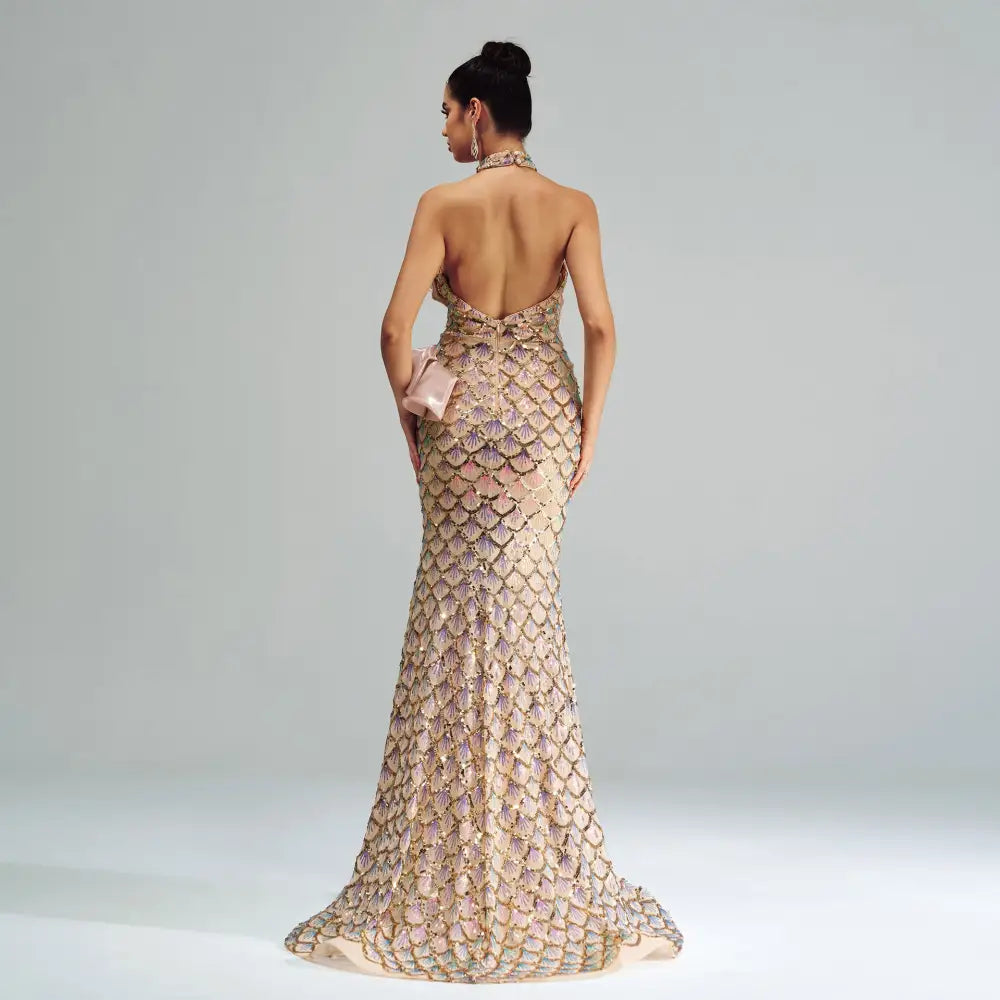 GlitzGlam Halter Mermaid Gown with Embellished Neckline