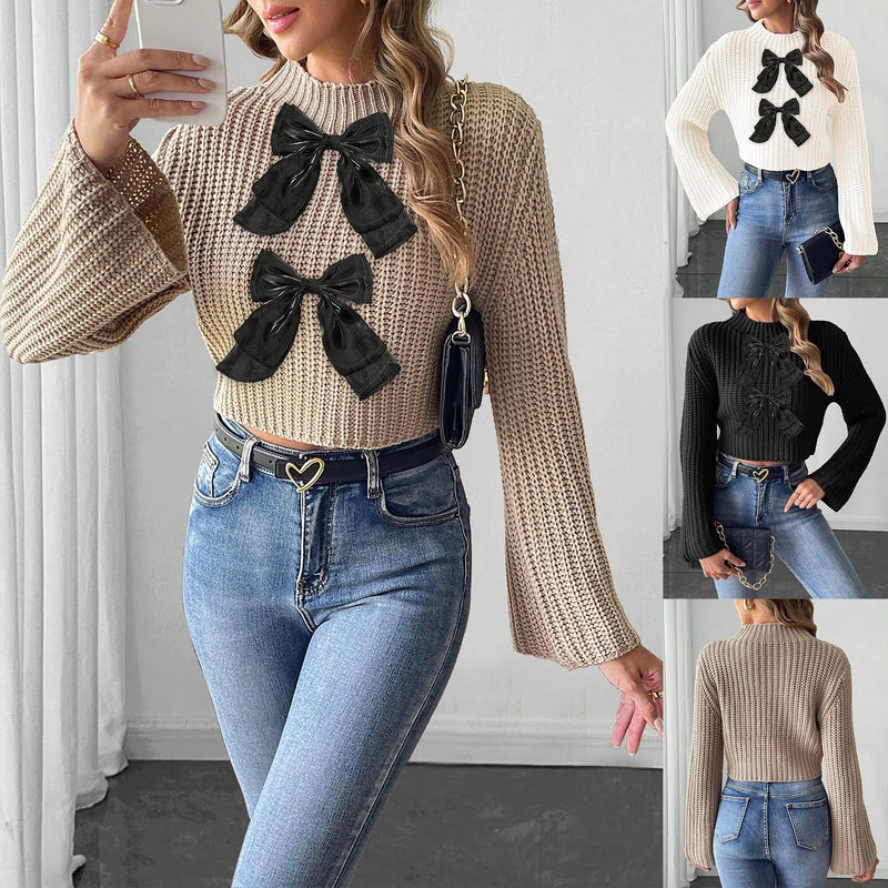 Discover elegance and comfort with this exquisitely designed Ladies Bow Patchwork Flared Sleeves Mock Neck Sweater. Crafted with attention to detail, this sweater features stylish flared sleeves and a sophisticated mock neck for a chic silhouette. The unique bow patchwork adds a touch of playful femininity, making it perfect for both casual outings and special occasions. Made from high-quality materials, it ensures warmth and durability. Pair it with your favorite jeans or skirt for a fashionable ensemble that stands out. Elevate your wardrobe with this versatile and timeless piece that promises to be a favorite staple.