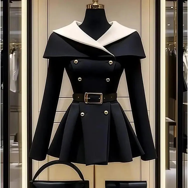 • SleekFit Black Belted Dress Coat with White Collar for Autumn - LauBelle Brand
