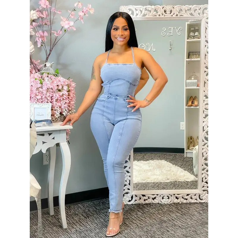 Elevate your style with our Slinky Denim Suspenders Jumpsuit. Made from high-quality denim fabric, this jumpsuit is both comfortable and stylish. The slinky silhouette flatters all body types and the suspenders add a touch of playfulness to your outfit. Perfect for a casual day out or a night out with friends, this jumpsuit can be dressed up or down. The adjustable suspenders allow for the perfect fit and the denim material ensures durability. With its modern and versatile design, this Slinky Denim Suspenders Jumpsuit is a must-have addition to your wardrobe. Order now and make a statement with your fashion choices!