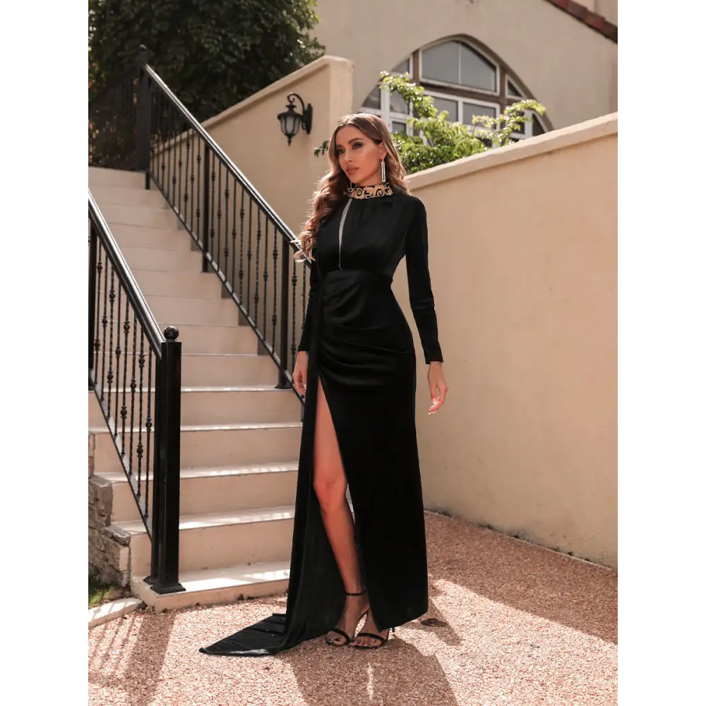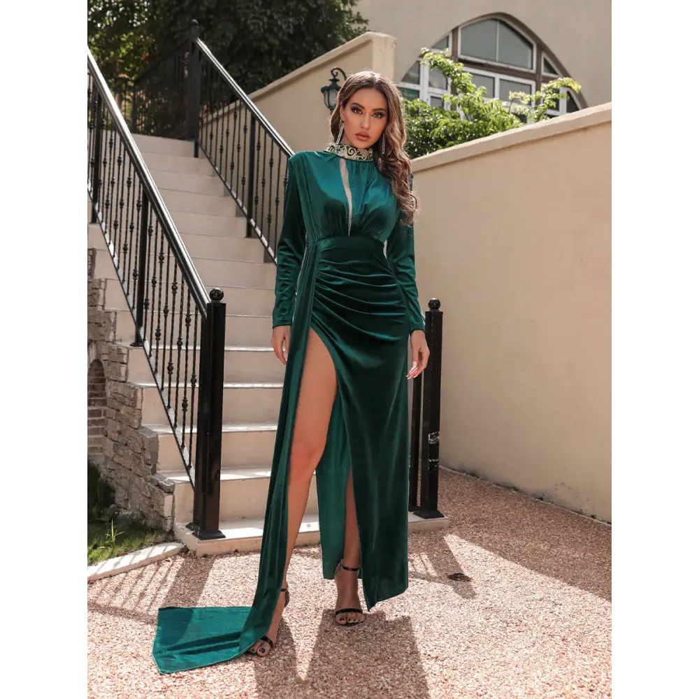 Embrace elegance with the Veluxe Women's Velvet High Neck Evening Dress, a perfect blend of sophistication and style. Crafted from luxurious velvet, this dress offers a smooth, lustrous finish, ensuring you stand out at any evening event. The high neck adds a touch of class, while the tailored fit flatters your silhouette. This timeless piece is designed for the modern woman who appreciates style and comfort. Whether attending a gala or a formal dinner, the Veluxe dress promises to make you feel confident and chic. Elevate your evening wardrobe with this exquisite piece.